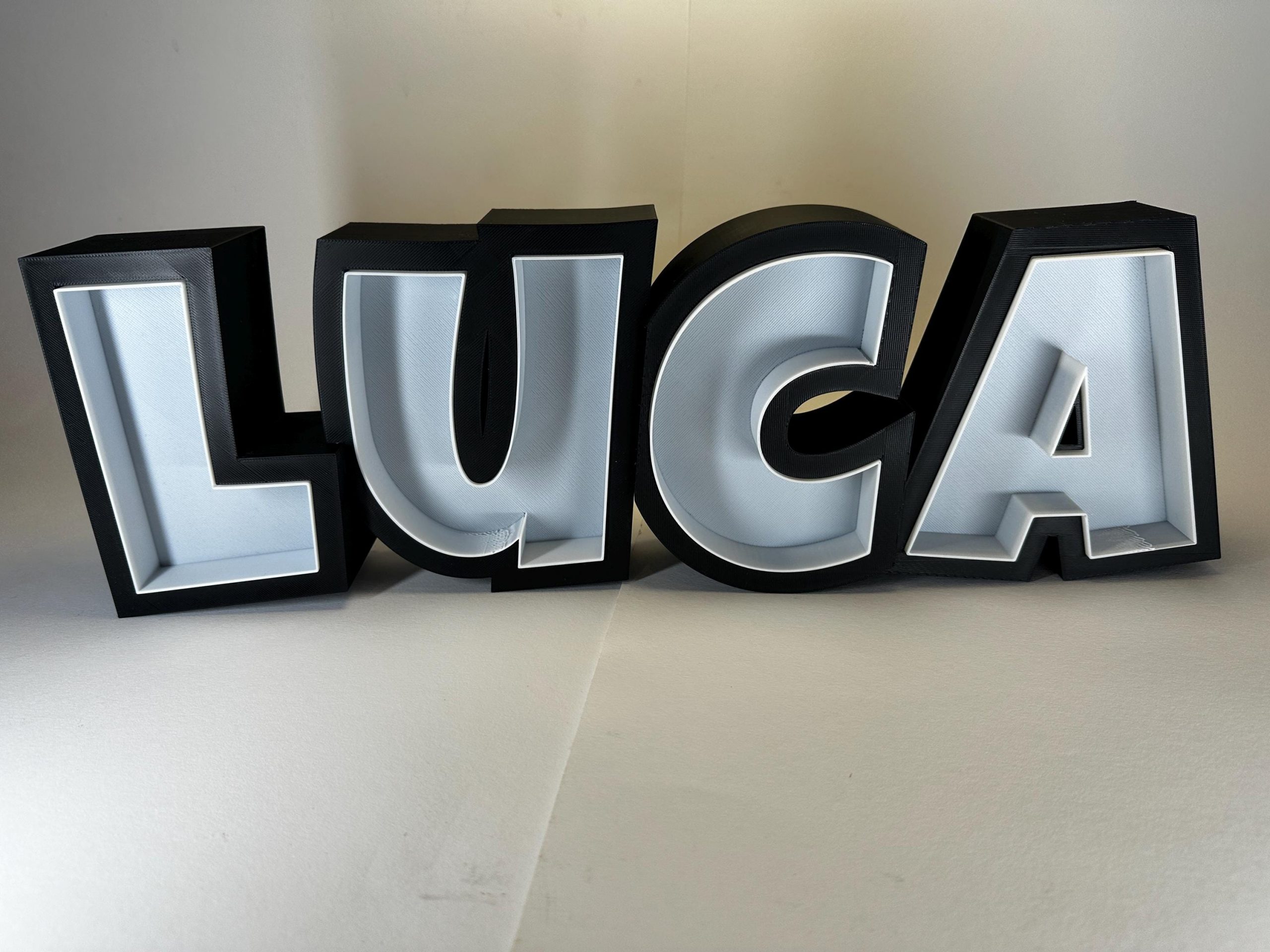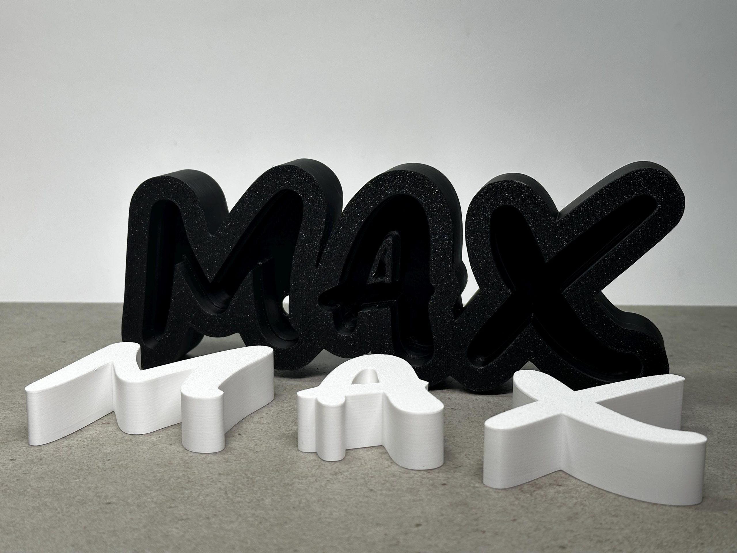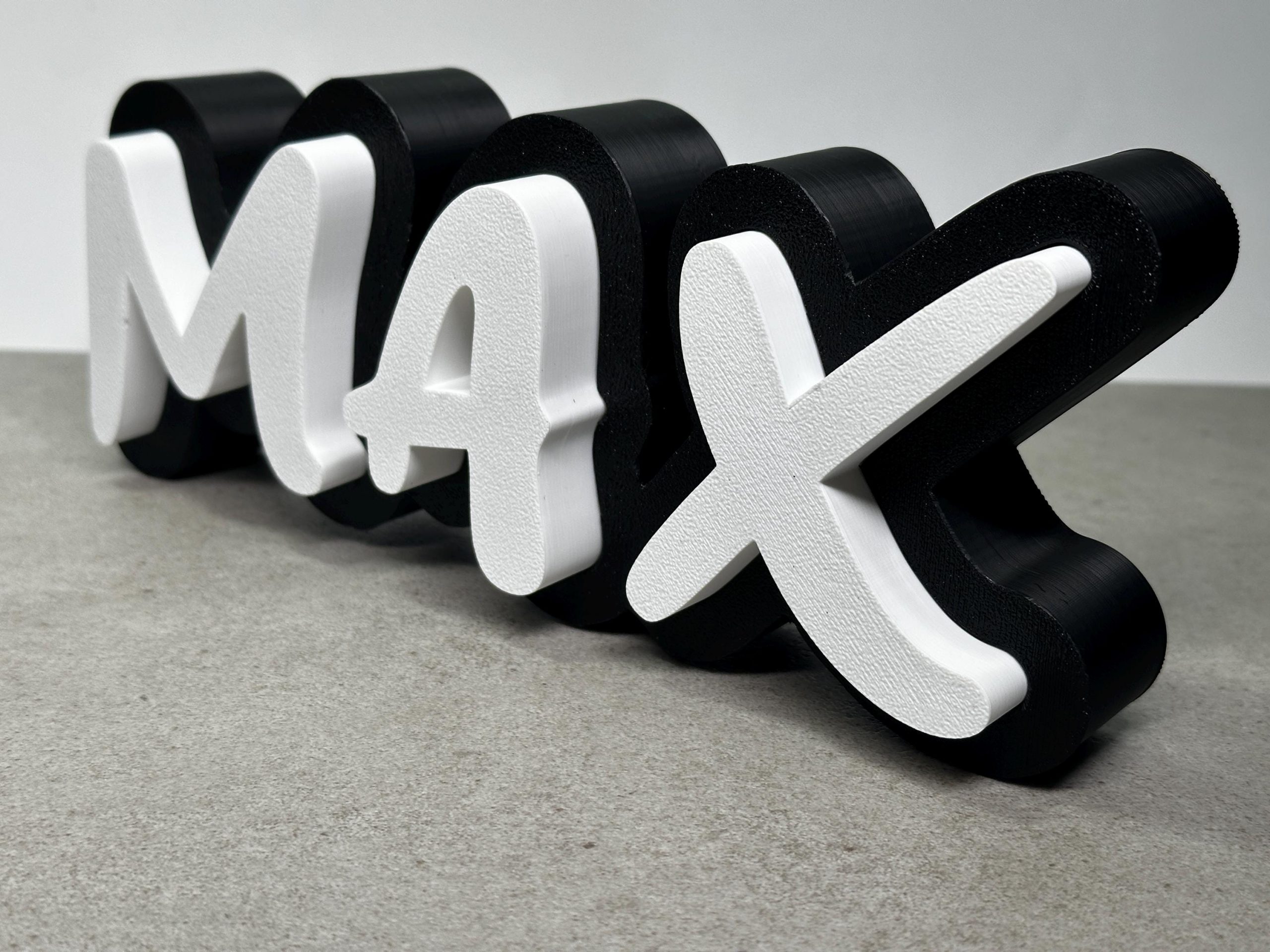 Der Schriftzug wird von uns im 3D-Druck-Verfahren aus PLA speziell für Sie hergestellt.