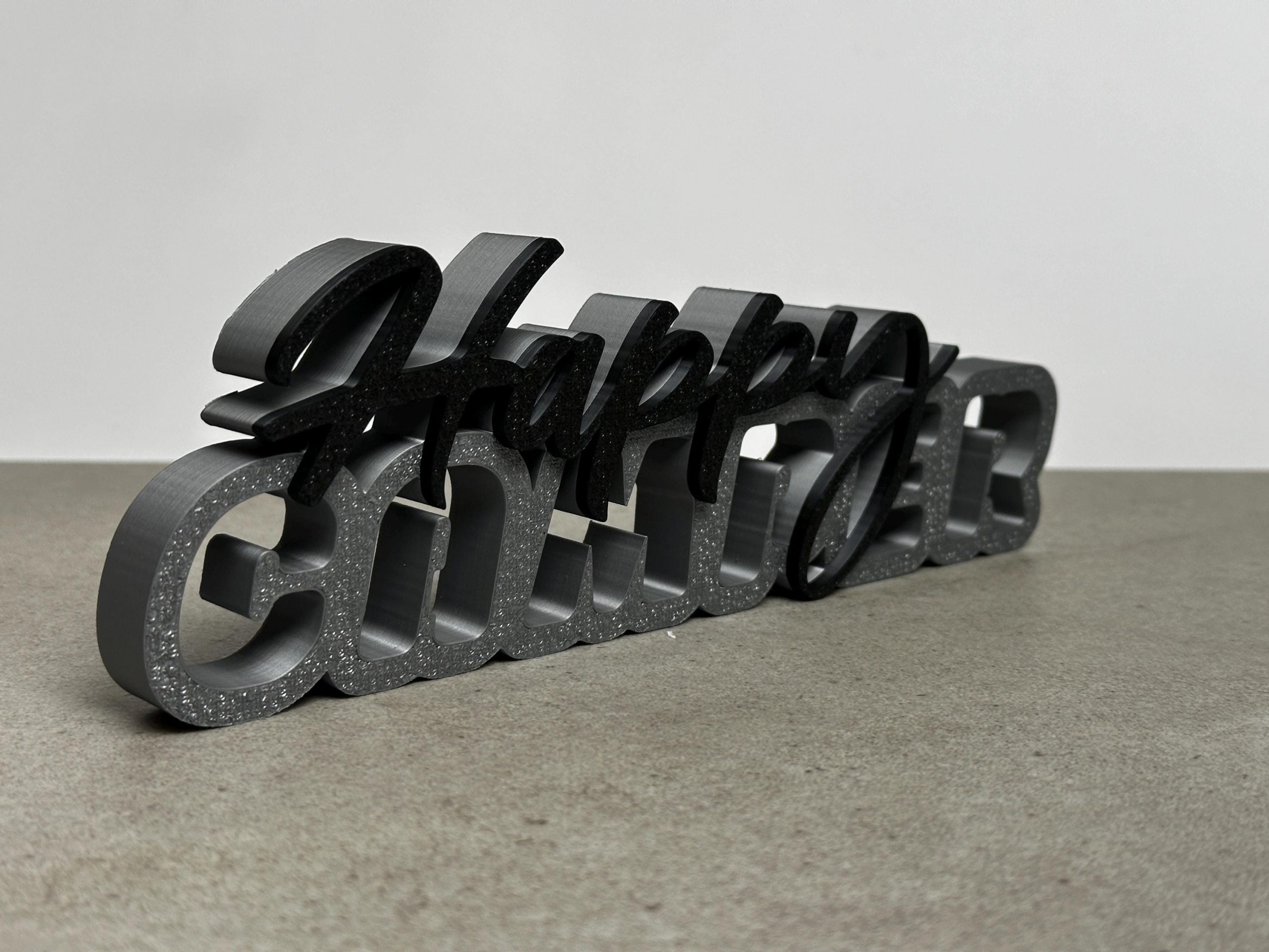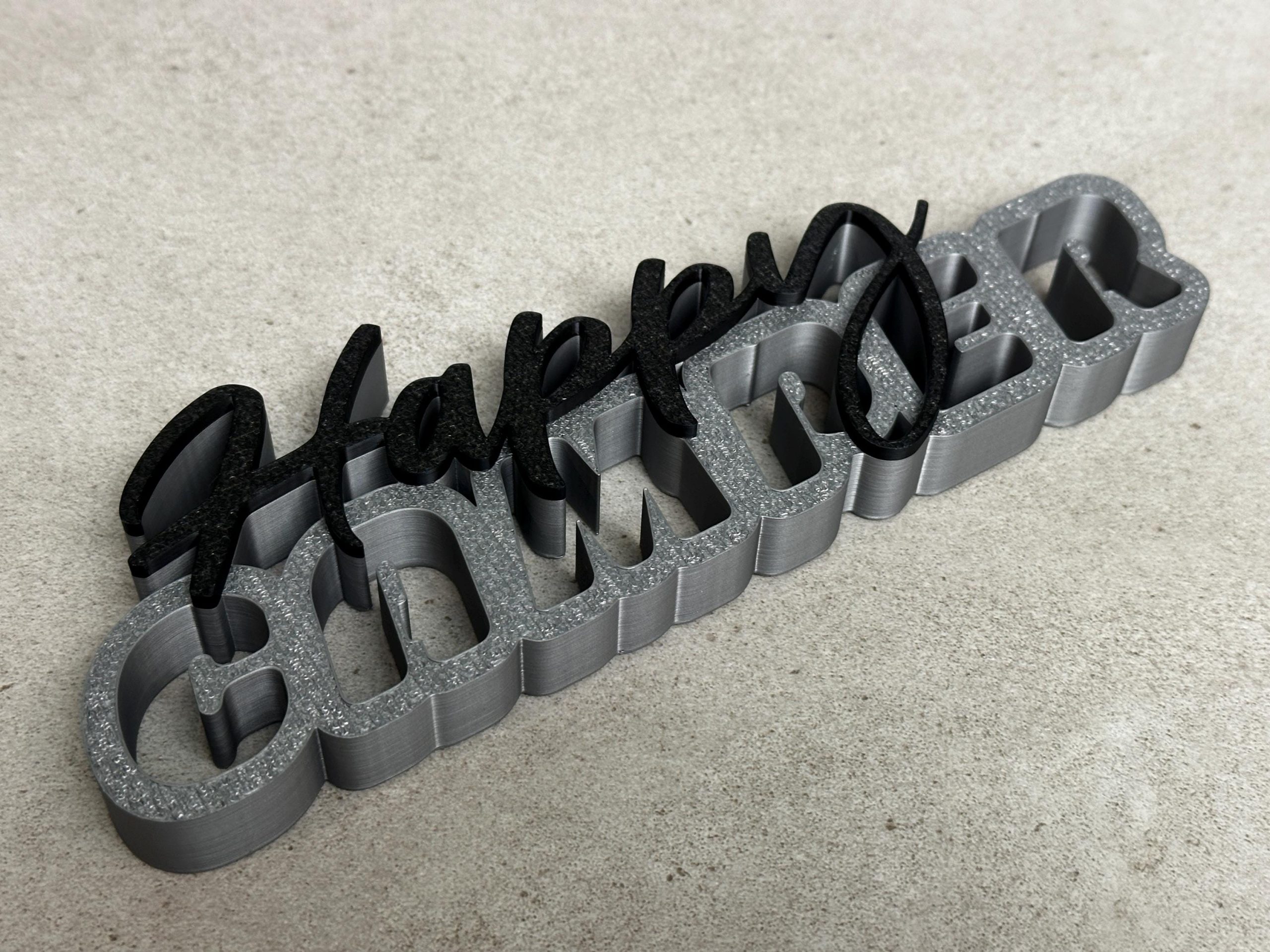 Der Schriftzug wird von uns im 3D-Druck-Verfahren aus PLA speziell für Sie hergestellt.